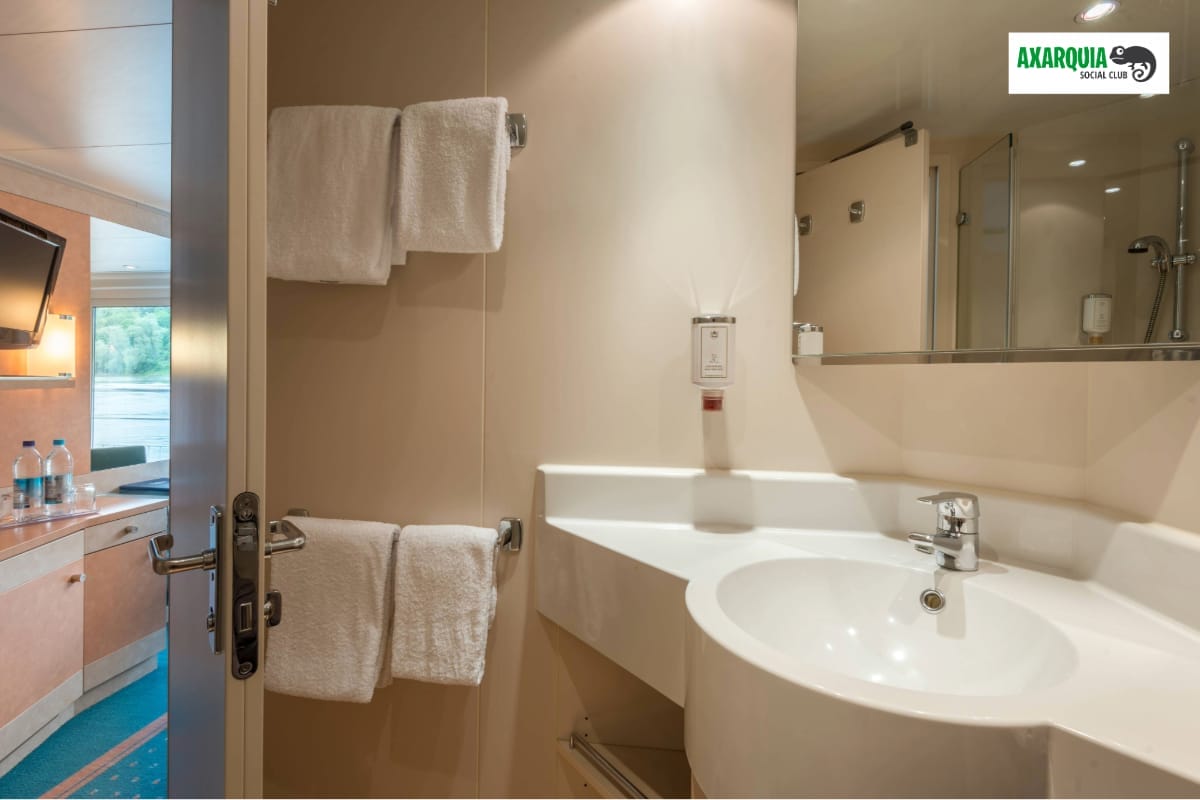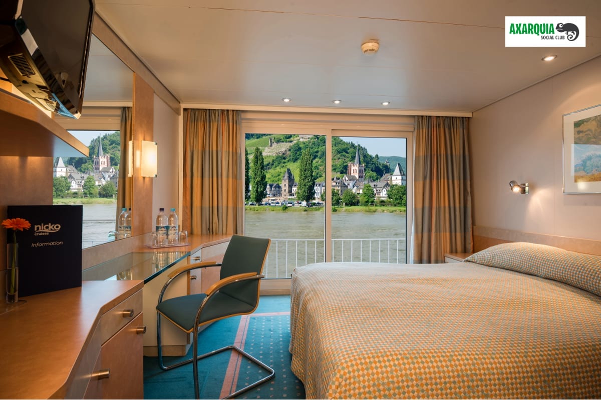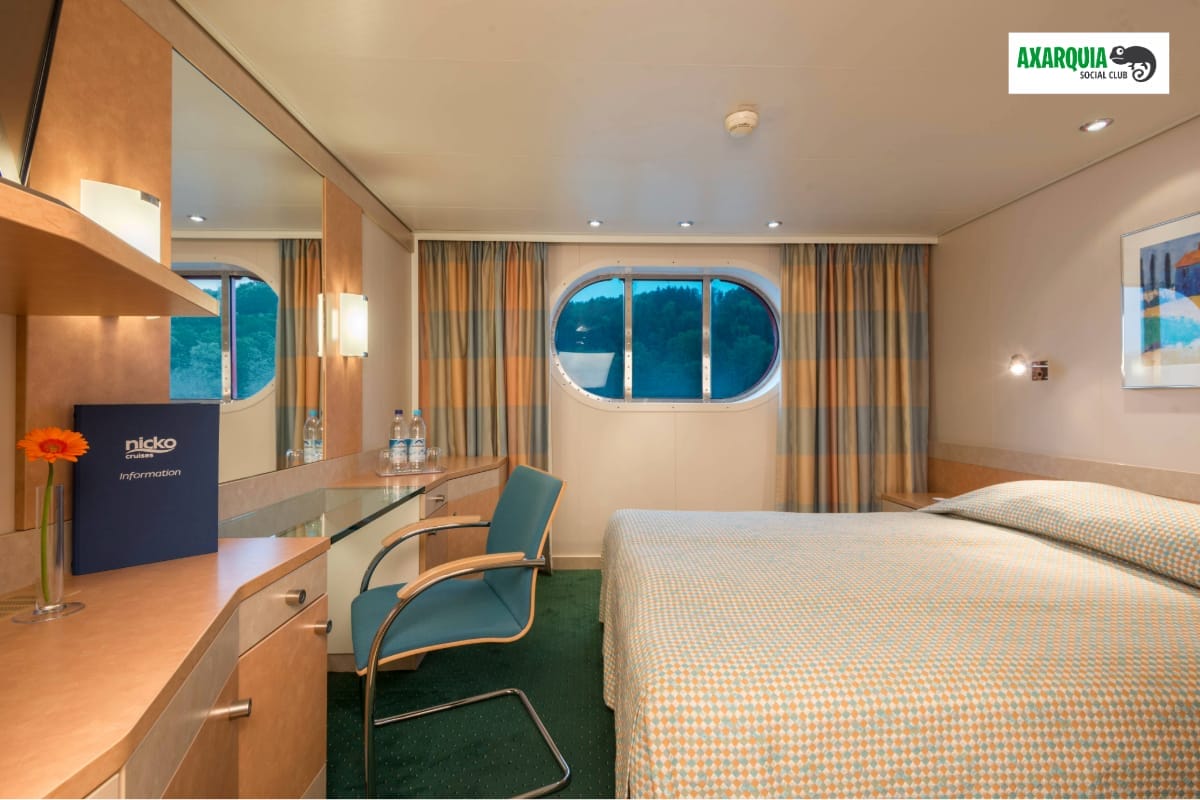 The cabins on the middle and upper deck have floor-to-ceiling panoramic windows that open (French Balcony).